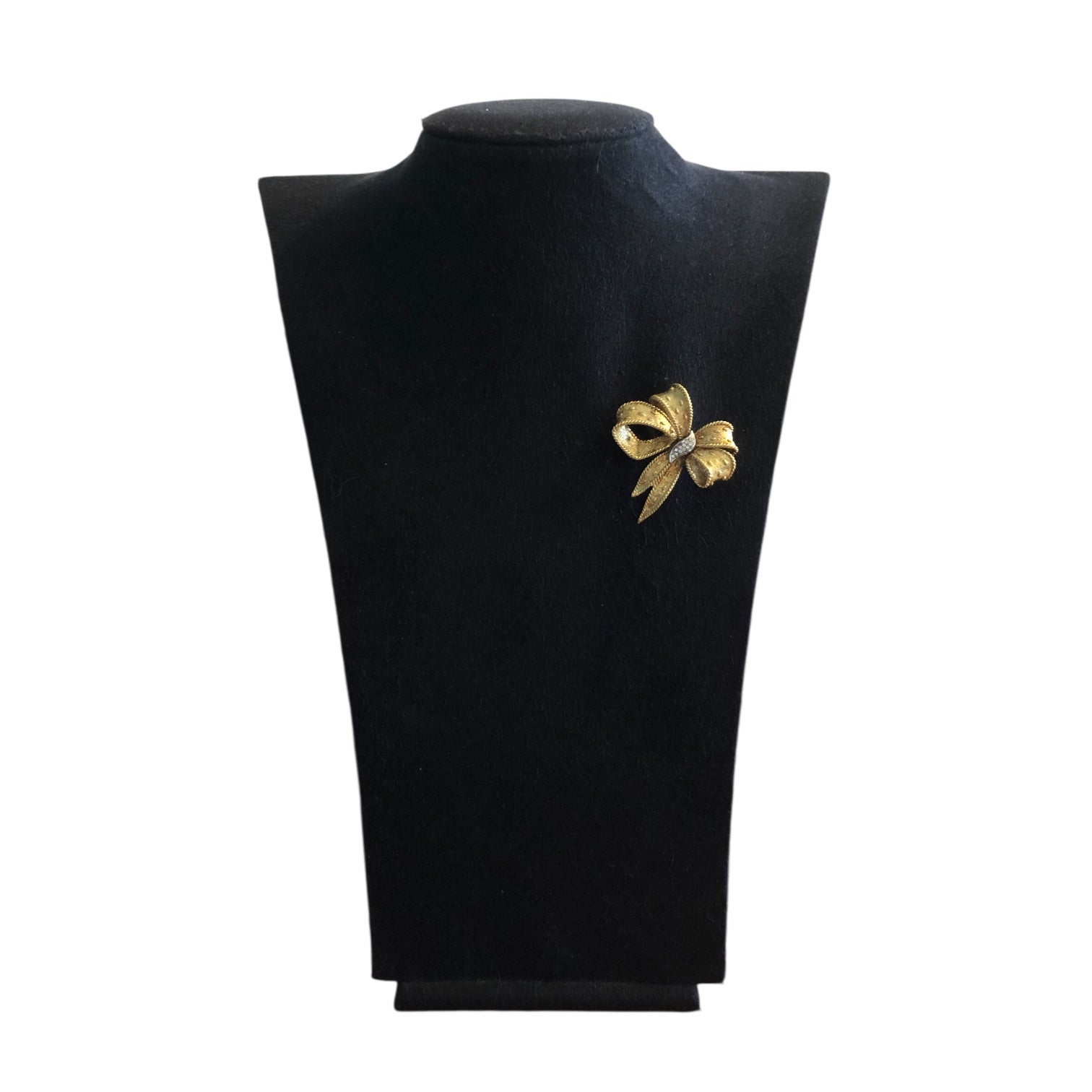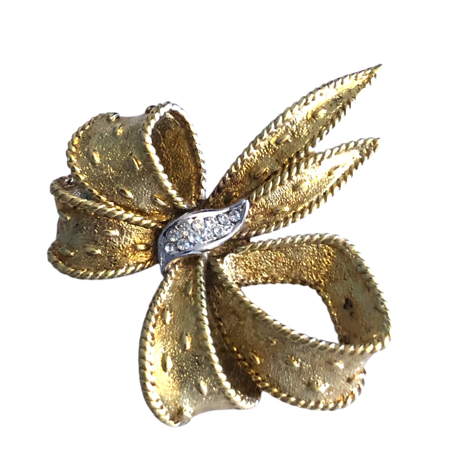 Vintage Carven brooch from the 1950s–1960s, numbered and signed on the back, likely from a haute couture collection. Shaped like a ribbon bow in gold-tone metal and set with rhinestones — a timeless classic to have in any jewelry box. A beautiful period piece, perfect for a collection or to complete a very couture look.
