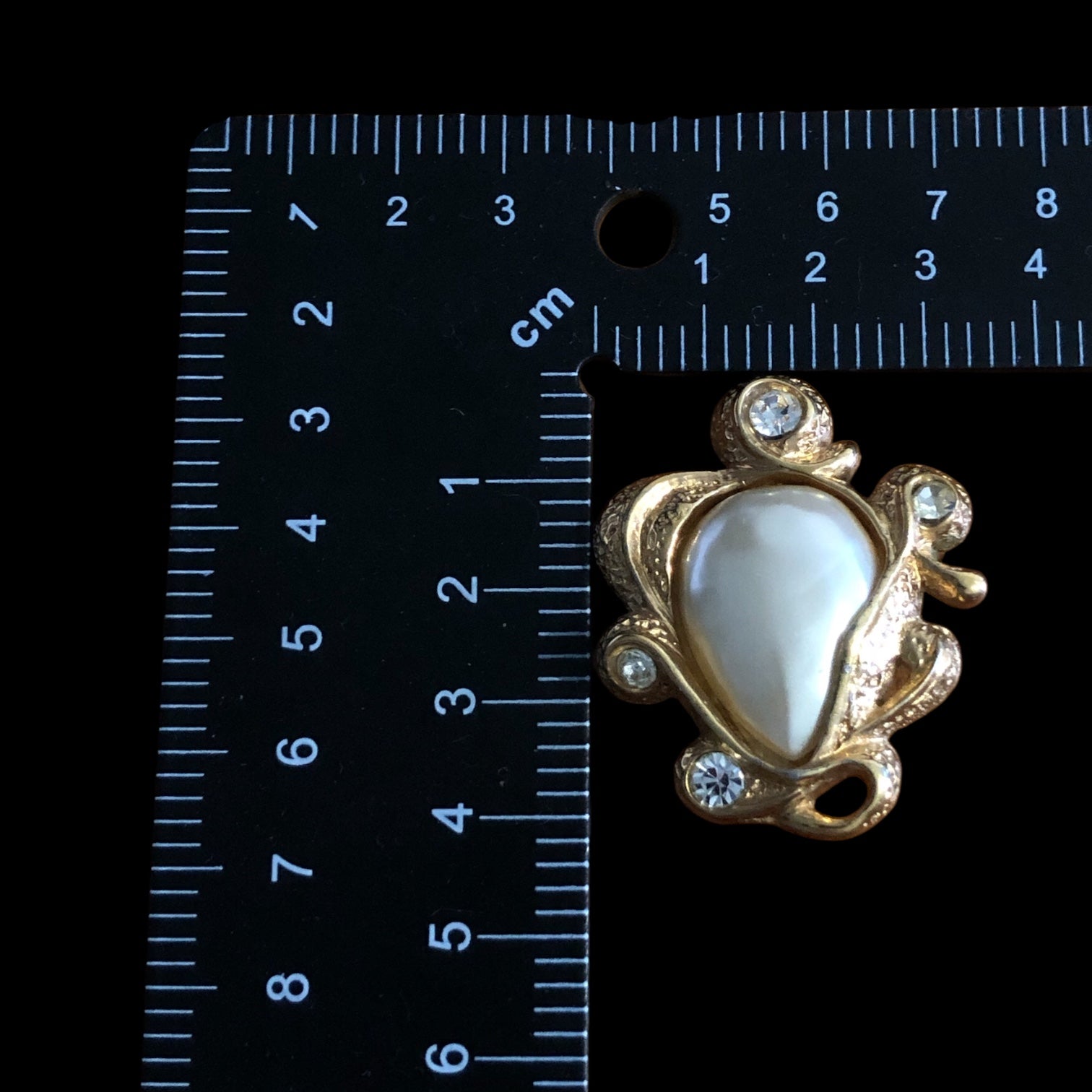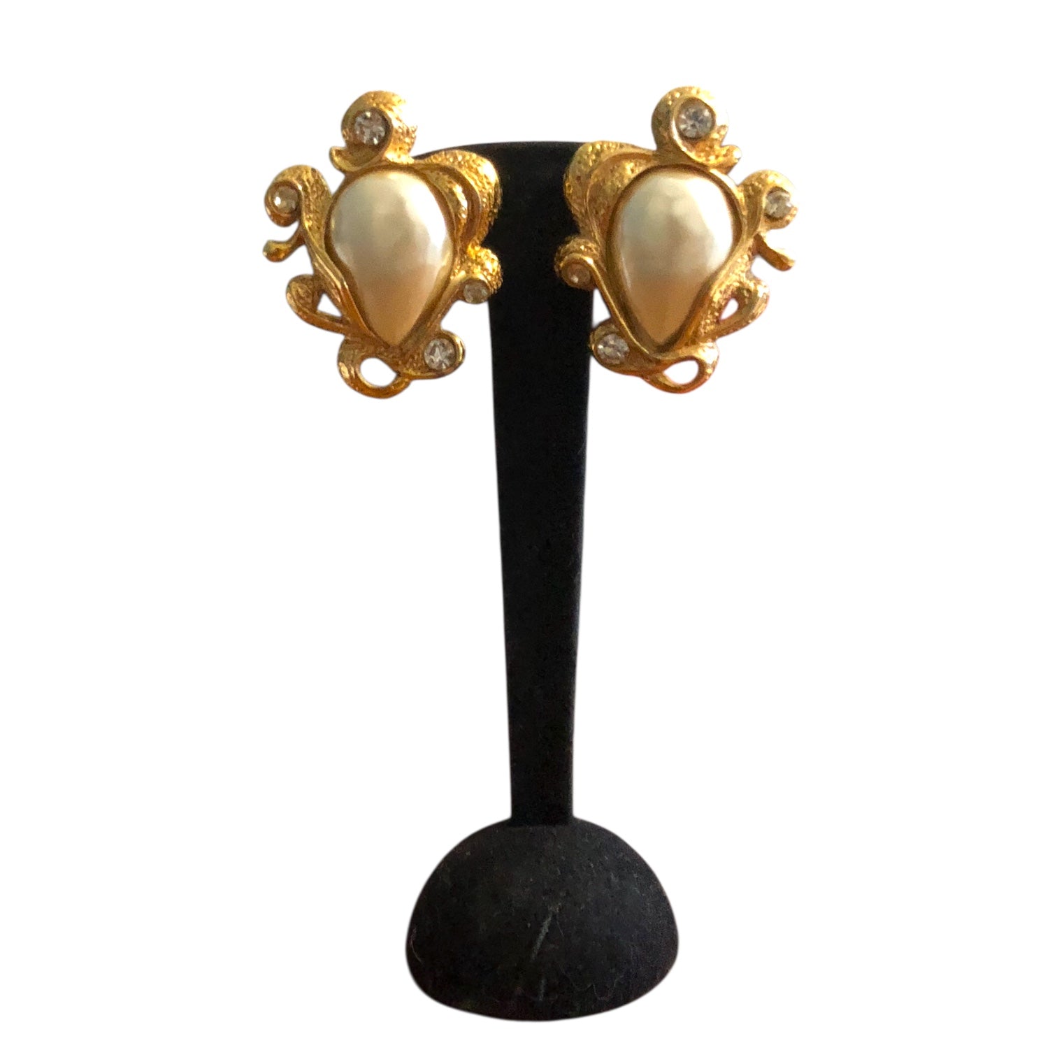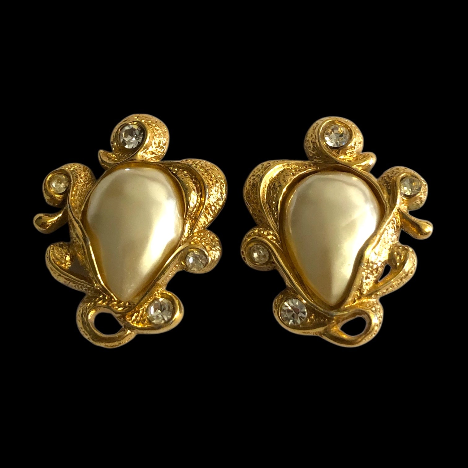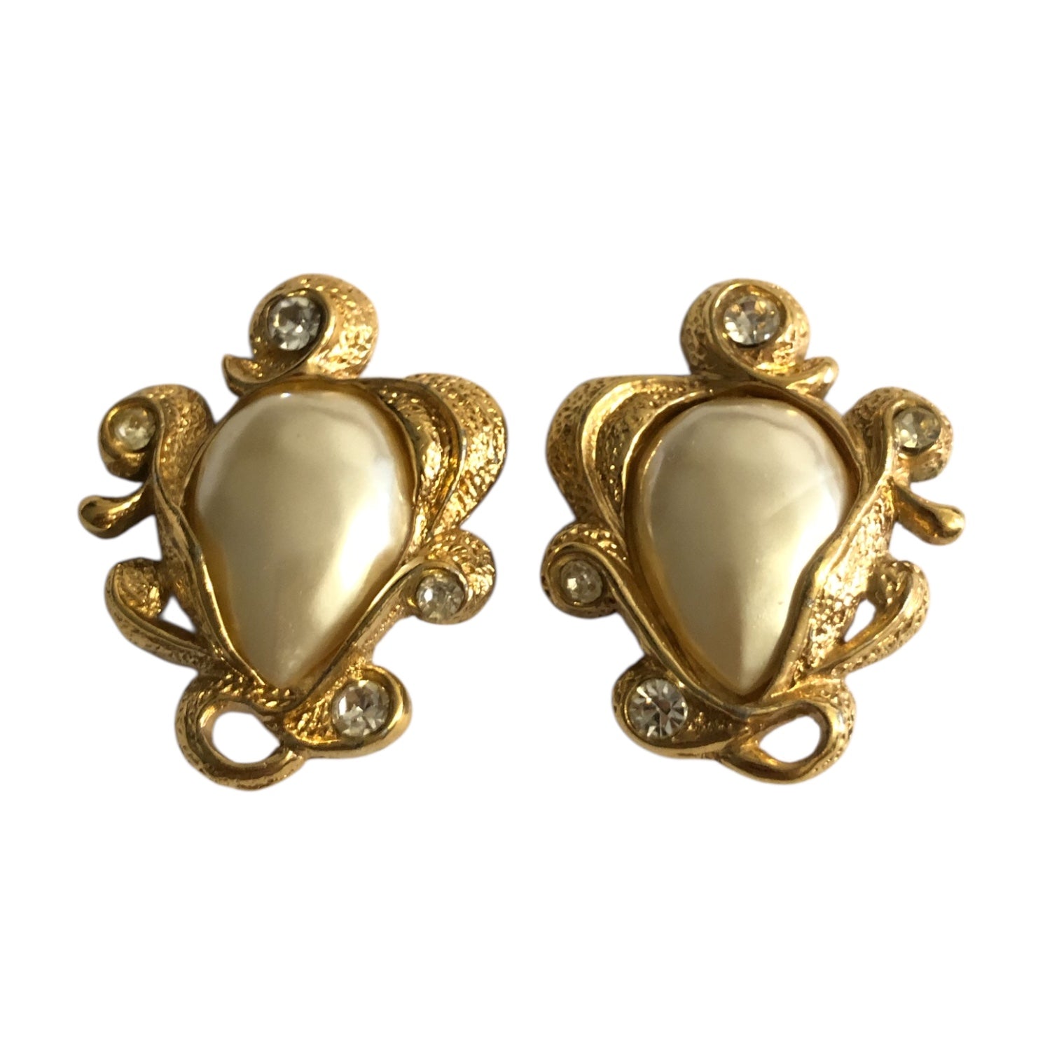 Vintage clip-on earrings from the 1970s, signed on the back. Crafted in gold-tone metal with rhinestones and costume pearls, they feature an elegant couture style. In excellent condition. Dimensions visible in the photo. Ideal for a gift, a collection, or to complete a retro-chic look.